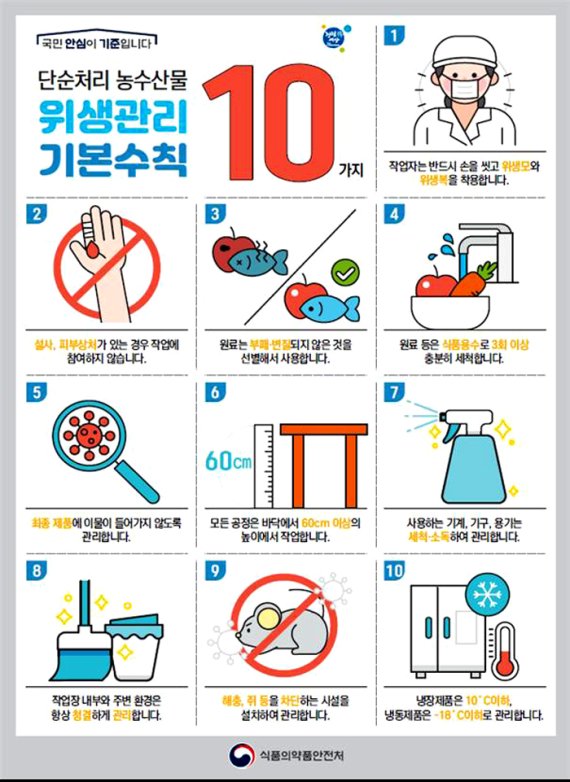 광주식약청은 지도·점검 결과 위반행위 적발 시에는 경중에 따라 행정처분 또는 현장지도를 통해 위반사항을 개선할 수 있도록 하고, 농산물 단순처리 위생 기본수칙 안내와 홍보도 병행할 예정이다.