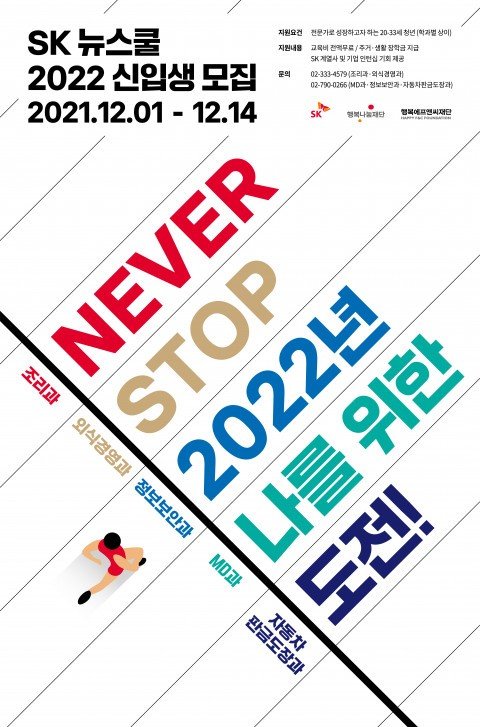 [서울=뉴시스] 이인준 기자 = 행복나눔재단, 행복에프엔씨재단, SK가 운영하는 청년 인재 양성 사회공헌 사업인 'SK 뉴스쿨'이 내달 1일부터 2주간 '2022년도 신입생'을 모집한다고 16일 밝혔다.