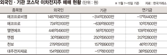 코스닥 시가총액 1위 셀트리온헬스케어를 맹추격 중인 에코프로비엠에는 이달에만 1488억원에 달하는 외국인 자금이 몰리고 있다. 코스닥시장 외국인 순매수 규모 2위 종목으로, 에코프로(724억원)와 천보(273억원), 대주전자재료(155억원) 등도 상위 15위권에 이름을 올렸다.