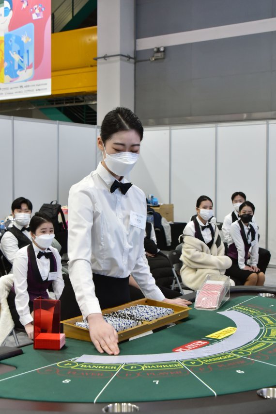 문화체육관광부 주최 2021 관광산업 일자리박람회의 오프라인 행사인 희망JOB FESTIVAL 마지막날 일정이 17일 서울 양재동 aT센터에서 열려 학생 카지노 경진대회에 참가한 관광고교생이 감독관 앞에서 기량을 펼치고 있다. 사진=서동일 기자