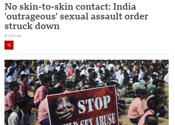 (서울=뉴스1) 박형기 기자 = 인도 법원에서 옷을 입고 있는데 여성의 가슴을 만지면 성추행은 성립해도 성폭행은 성립하지 않는다는 판결이 나왔다고 영국의 BBC가 18일 보도했다.