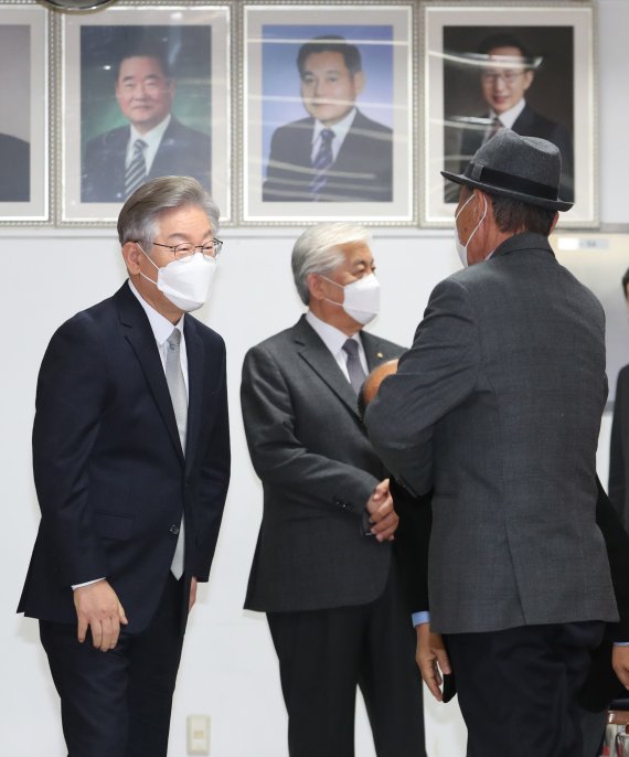 [서울=뉴시스] 국회사진기자단 = 이재명(왼쪽) 더불어민주당 대선 후보가 19일 오전 서울 종로구 경주이씨중앙화수회관에서 열린 제29대 5차 상임회장단회의에서 참석자들과 인사를 나누고 있다. 회의실 벽면에 이건희 전 삼성회장과 이명박 전 대통령의 액자가 걸려 있다. 2021.11.19. photo@newsis.com [서울=뉴시스] 류현주 기자 = 이재명 더불어민주당 대선 후보가 19일 오전 서울 종로구 경주이씨중앙화수회관에서 열린 제29대 5차 상임회장단회의에 참석했다.