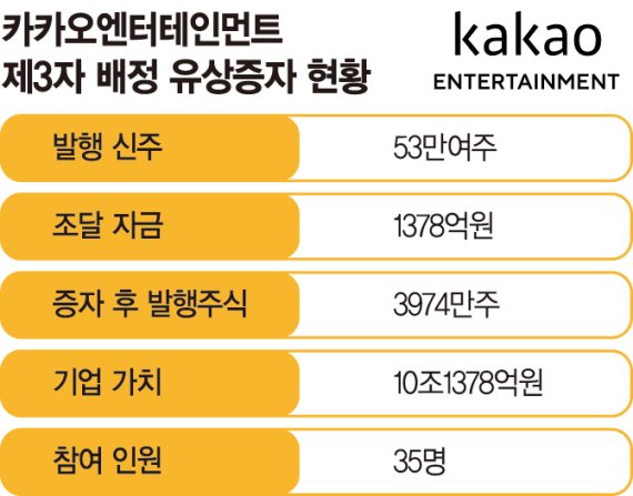 이번에 발행되는 신주는 53만여주로 주당 25만5116원이다. 유증을 통해 조달되는 자금은 총 1378억원 정도다. 증자 후 카카오엔터의 발행주식수는 3974만여주가 된다. 지분 100%의 가치를 환산하면 10조1378억원이다.
