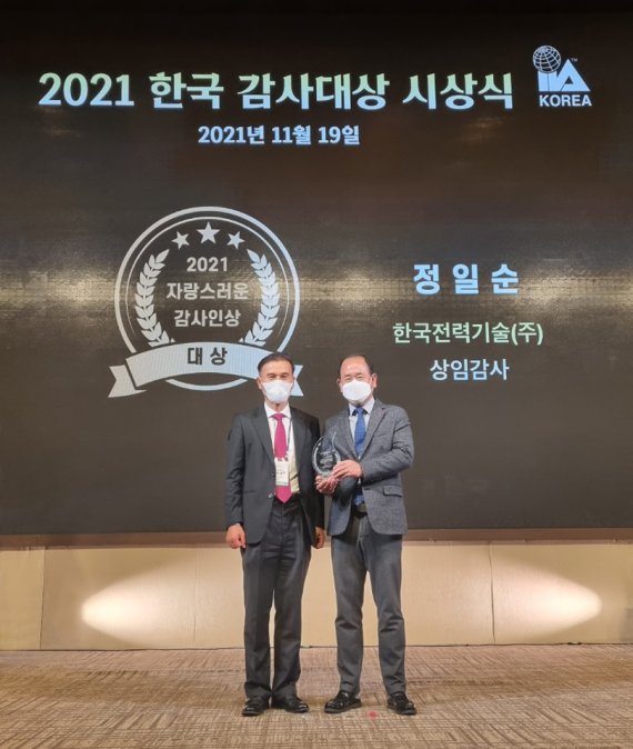 정일순 상임감사는 공공기관 신뢰 회복과 국가 에너지사업 보호를 위해 사회적 가치 지향 윤리경영 지원 및 사회적 책무 위반 방지, 수요자 중심 감사제도 구축, 적극행정 지원, 대내외 위험 대응 예방적 내부통제 등을 위해 노력한 성과를 높게 평가받아 '자랑스러운 감사인'상을 수상했다.