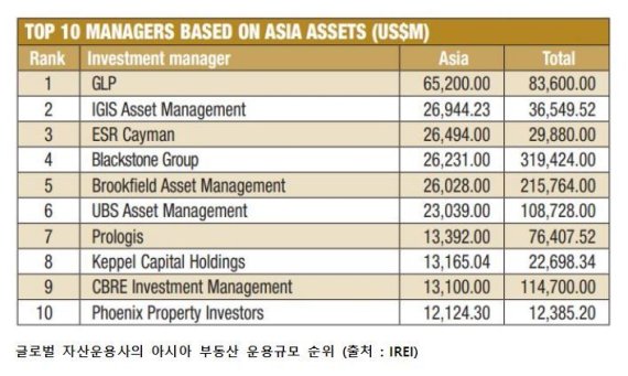 이지스자산운용의 아시아 부동산 AUM은 싱가포르의 GLP(Global Logistic Properties)에 이어 전 세계 2위다. 2019년말 기준 3위에서 한 단계 올라왔다.
