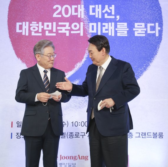 [서울=뉴시스] 국회사진기자단 = 이재명 더불어민주당 대선 후보와 윤석열 국민의힘 대선 후보가 24일 서울 종로구 포시즌스 호텔에서 열린 '2021 중앙포럼'에 참석해 인사하고 있다. 2021.11.24. photo@newsis.com [서울=뉴시스] 류현주 기자 = 이재명 더불어민주당 대선 후보와 윤석열 국민의힘 대선 후보가 24일 2021 중앙포럼에서 만났다.