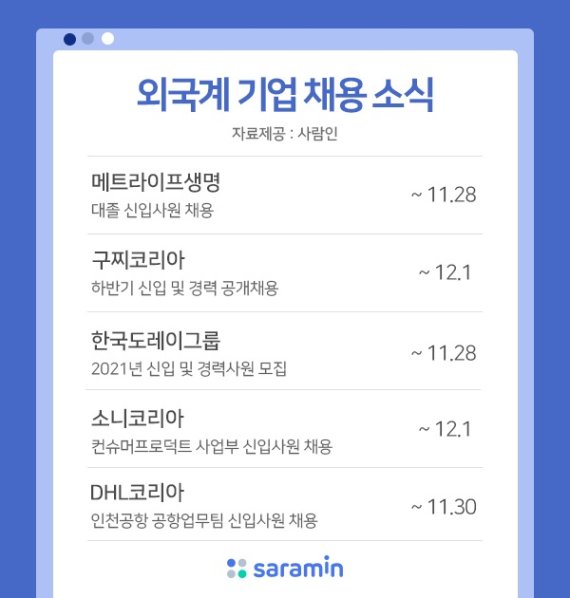 [서울=뉴시스] 박정규 기자 = 국내에 진출한 외국계 대기업들의 채용이 이어지고 있다. 외국계 글로벌 대기업들은 높은 안정성과 시장지배력, 외국어 사용과 해외 경험 기회, 선진 기업문화 등으로 취업준비생들에게 인기가 높은 곳이기도 하다.
