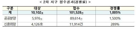 한국토지주택공사(LH)는 지난 10월 25일부터 11월 5일까지 남양주 왕숙2지구 등 10개 지구 1만102가구에 대한 2차 사전청약을 실시한 결과, 총 10만1528명이 신청해 평균 10대 1의 경쟁률을 기록했다고 25일 밝혔다.