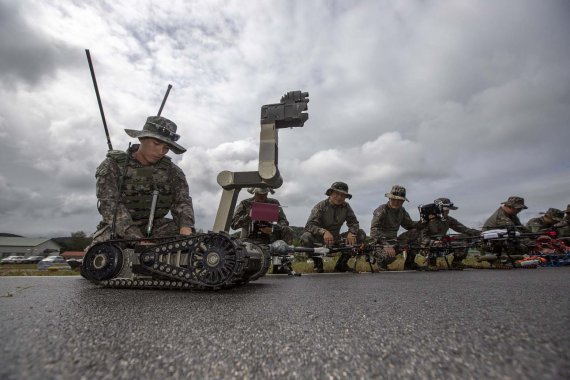【서울=뉴시스】 육군은 28일 경기도 용인 3야전군사령부 영내에서 군 부사령관 주관으로 드론봇 전투단이 예하에 편성된 지상정보단 창설식을 갖는다. 내년 1월 출범할 지상작전사령부의 임무수행을 위한 정보 분야를 지원하게 될 지상정보단은 드론봇 전투단, 운영분석대대, 대정보대대 등으로 구성되며 단계적으로 부대규모를 여단급으로 확장하고 첨단 감시정찰자산을 전력화할 계획이다. 사진은 드론봇 전투단 장병들이 부대 인근 활주로에서 드론과 로봇 운용기술을 숙달하고 있는 모습. 2018.09.28. (사진=육군 제공) photo@newsis.com [서울=뉴시스] 박대로 기자 = 육군은 26~27일 경기 양주시 가납리 비행장에서 민·관·군이 함께하는 제3회 육군 드론봇 전투경연대회를 개최한다.