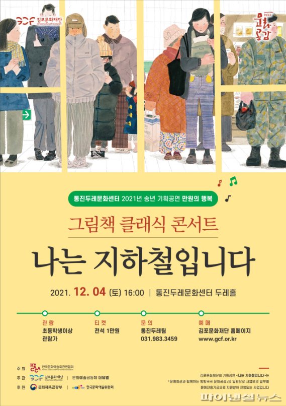 【파이낸셜뉴스 김포=강근주 기자】 김포문화재단이 ‘그림책 클래식 콘서트 : 나는 지하철입니다’ 공연을 오는 12월4일 오후 4시 통진두레문화센터 두레홀에서 개최한다.
