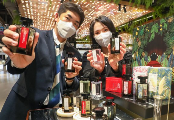 [파이낸셜뉴스] 현대백화점면세점은 무역센터점 9층에서 프랑스 니치 향수(소량 생산되는 고급 향수) 브랜드 '라티잔 퍼퓨머'를 선보인다. '라티잔 퍼퓨머'는 1976년 프랑스 파리에서 설립된 세계 최초의 니치 향수 브랜드로, 매장에서는 '파사지 덩페르 레드' '파사지 덩페르 엑스트렘' 등 대표 향수와 바디 케어 제품 등 총 30여 종을 선보인다. 28일 서울 강남구 현대백화점면세점 무역센터점 9층 라티잔 퍼퓨머 매장에서 직원들이 상품을 소개하고 있다.