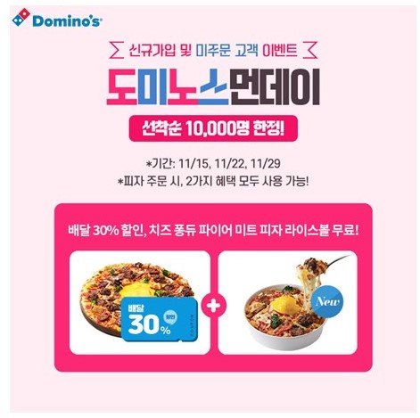 도미노피자는 이날 신규 및 미주문 고객에게 피자 30% 할인 쿠폰과 치즈 퐁듀 피자 라이스볼 1개를 무료 증정한다. 피자 라이스볼 무료 혜택은 오늘까지만 사용할 수 있으며 30% 할인 쿠폰은 12월 5일까지 사용할 수 있다. 이 두 가지 혜택을 중복 이용이 가능하며 일부 매장은 제외된다.