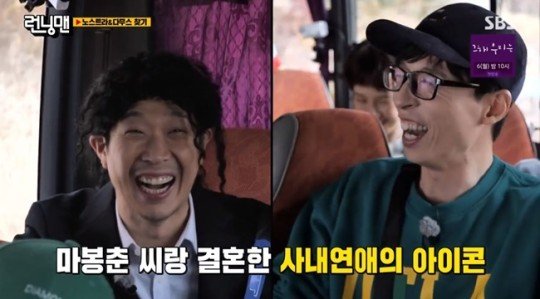 이날 버스에서 유재석은 김종국, 송지효를 향해 "일하면서 이 안에서 연애하는 거 반대해요"라고 말했다. 이에 하하는 "자기는 나경은이랑 결혼했으면서"라고 말해 웃음을 자아냈다.