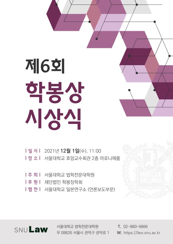 [서울=뉴시스]김광주 인턴 기자 = 서울대학교 법학전문대학원은 내달 1일, '제6회 학봉상' 시상식을 개최한다고 29일 밝혔다.