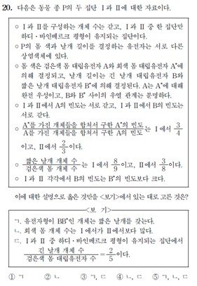 평가원은 수능 직후부터 출제오류가 제기된 생명과학Ⅱ 20번 문항에 대해서도 '정답에 이상이 없다'는 판정을 내렸다. 이 문항은 집단Ⅰ과 Ⅱ 중 하디·바인베르크 평형이 유지되는 집단을 찾고, 이를 바탕으로 '보기'의 진위를 판단할 수 있는지 평가하는 문항이다.