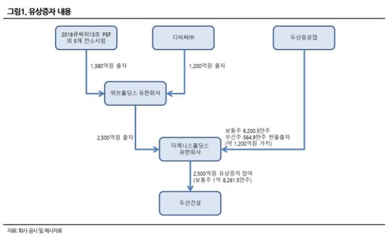 두산건설은 19일 이사회를 통해 2500억원 규모의 제3자배정 유상증자 실시를 결정했다. 이에 두산건설의 최대주주는 큐캐피탈파트너스가 보유한 '2018큐씨피13호사모투자합자회사'의 더제니스홀딩스 유한회사로 바뀐다. 더제니스홀딩스는 두산건설 지분 53.6%를 보유하게 된다.