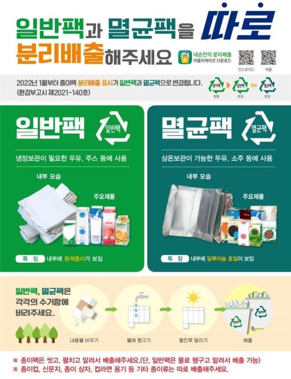 환경부는 일반팩과 멸균팩 분리배출 전용 수거함과 봉투를 다음 달 중순까지 배포한다. 지자체는 분리배출된 일반팩과 멸균팩을 섞이지 않도록 수거한 후 재활용한다.