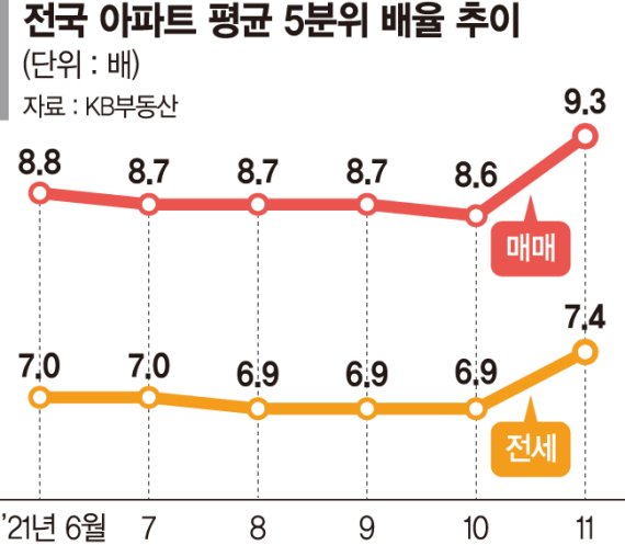 11월 30일 KB부동산의 '11월 월간주택시장 동향'에 따르면 전국 아파트 평균 5분위 배율은 매매 9.3, 전세 7.4로 집계됐다. 전월대비 각각 0.7과 0.5씩 높아진 것으로, 관련 조사를 시작한 2008년 12월 이후 가장 높은 수치다.