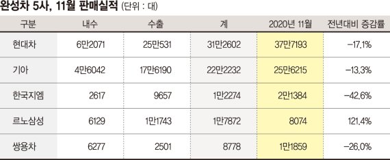 1일 완성차 5사에 따르면 현대차는 11월 국내 6만2071대, 해외 25만531대 등 전년동월 대비 17.1% 감소한 31만2602대를 판매했다. 전년동월 대비 국내는 11.4% 감소, 해외는 18.4% 감소했다.