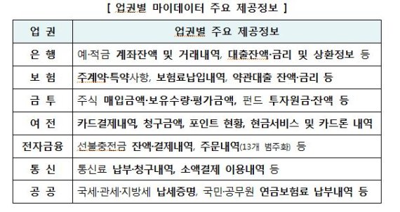 예컨대 여러 금융 앱을 사용할 필요 없이 하나의 마이데이터 서비스 앱에서 대출이자 납부일, 카드대금결제일 등을 확인하는 등 모든 금융정보를 관리할 수 있다. 또 본인의 현재 신용과 재무상태에서 이용할 수 있는 금융상품 목록을 볼 수 있고, 가격·혜택을 상세 비교해 본인에게 최적화된 금융상품 추천과 재무컨설팅도 지원받을 수 있다.