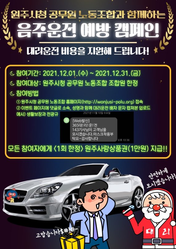 (원주=뉴스1) 신관호 기자 = 강원 원주시청 공무원노동조합이 이달 대리운전 비용 지급 이벤트에 나서 화제가 되고 있다.