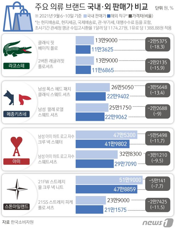 한국소비자원은 라코스테, 메종키츠네, 아미, 스톤아일랜드 등 수입 의류 4개 브랜드 8개 제품의 국내 구매 가격과 해외직구 가격을 최저가 기준으로 조사한 결과 이같이 나타났다고 3일 밝혔다.