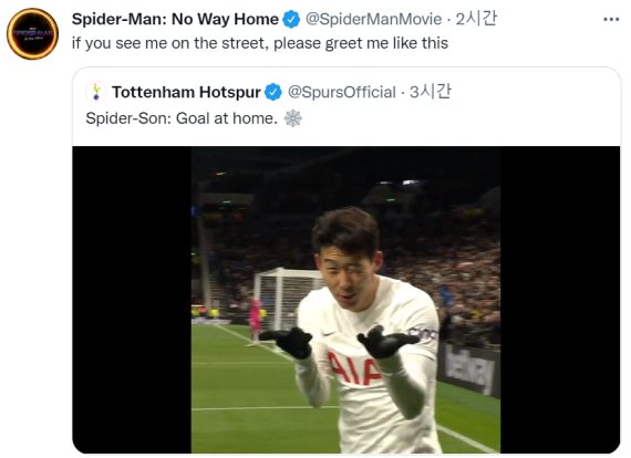 토트넘 공식 트위터 계정에 게시된 '스파이더-손: 홈에서 득점(Spider-Son: Goal at home)' 게시글을 리트윗하면서 "길에서 나를 보면 이렇게 인사해 달라(if you see me on the street, please greet me like this)"는 글을 게시했다.