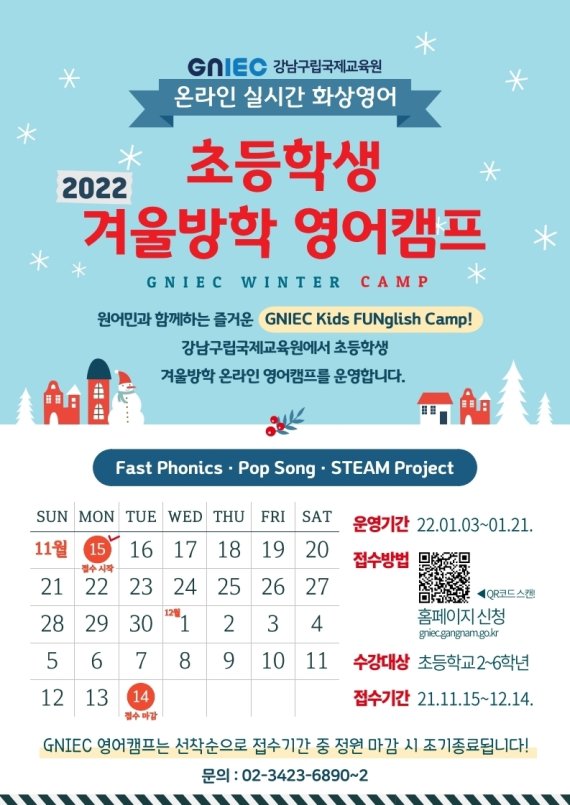겨울방학 영어캠프는 14일까지 초등학교 2~6학년 참가자를 모집한다. 다음 달 3~21일 3주 동안 원어민 강사가 세 가지 강좌를 진행할 예정이다.
