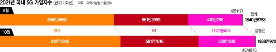 지난 10월 기준 이동통신사별 5G 순증 가입자는 SK텔레콤이 47만7372명으로 KT(30만3857명), LG유플러스(19만184명)를 크게 앞섰다.