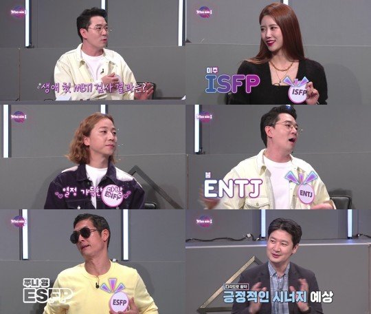 넉살은 "나는 끝없는 열정가! ENFP 성향이다. 불타는 열정으로 매일 머리 스타일을 정리한다"고 했다. 박준형은 "나는 자유로운 영혼이라 할 수 있는 ESFP로 이보다 나를 잘 설명 할 수 없을 것 같다"고 전했다.