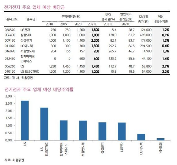 현재 주가에서 배당수익률은 LS(2.7%), LS ELECTRIC(2.2%), 한화에어로스페이스(1.4%), 서울반도체(1.3%), 삼성전기(1.2%), LG전자(1.2%), LG이노텍(0.4%), 삼성SDI(0.1%) 순서로 높을 것으로 키움증권은 예상했다.