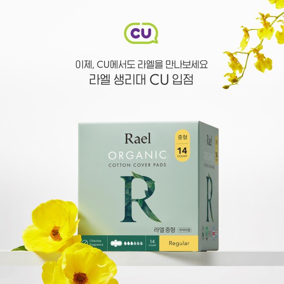 CU를 통해 만날 수 있는 라엘의 '유기농 순면커버 생리대'는 중형 4개입, 중형 14개입, 대형 12개입이다. 중형 4개입은 갑작스러운 생리 현상으로 당황할 수 있는 여성들을 위해 마련된 편의점 전용 제품으로 휴대가 간편하다.