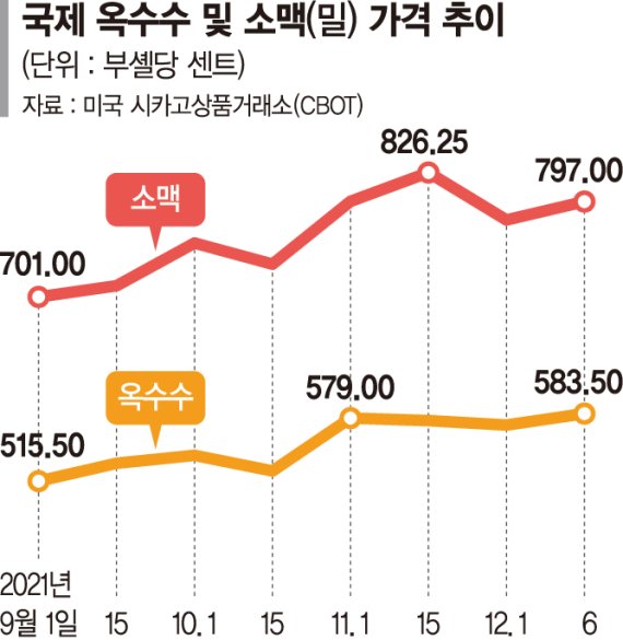 옥수수, 소맥 등 농산물 가격이 급등한 영향이 컸다. 미국 시카고 상품거래소(CBOT)에서 옥수수 가격은 지난 3일 기준 부셸당 586.00센트로 9월초에 비해 14.73% 뛰었다. 소맥 가격 역시 같은 기간 13.69% 상승했다. 잠시 주춤했던 대두도 지난달부터 오름세를 탔고, 국제 원두 가격 기준이 되는 커피 선물 가격은 지난 6일 파운드당 250.20센트라는 진기록을 썼다.