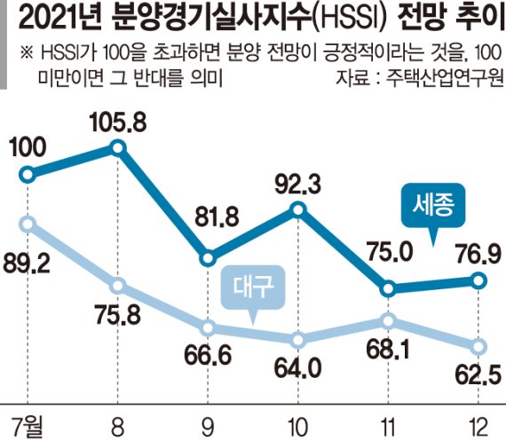 권영선 주산연 책임연구원은 "세종과 대구는 공급이 늘면서 분양경기와 아파트값이 동반 하락세가 나타나는 상황"이라며 "아파트 시세가 떨어진다는 것은 사업자가 원하는 분양가를 실현하기 어렵다는 뜻이기 때문에 분양경기 전망이 어두울 수밖에 없다"고 말했다.