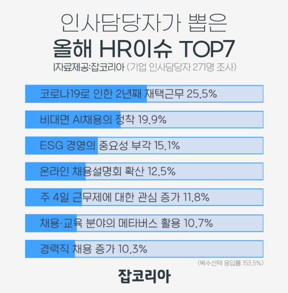 잡코리아는 국내기업 인사담당자 271명을 대상으로 ‘올해 HR분야에서 가장 관심을 받은 일은 무엇이라고 생각하는지’ 복수응답으로 조사했다. 조사결과 1위로 ‘코로나19로 인한 2년째 재택근무’를 꼽은 응답자가 25.5%로 가장 많았다.