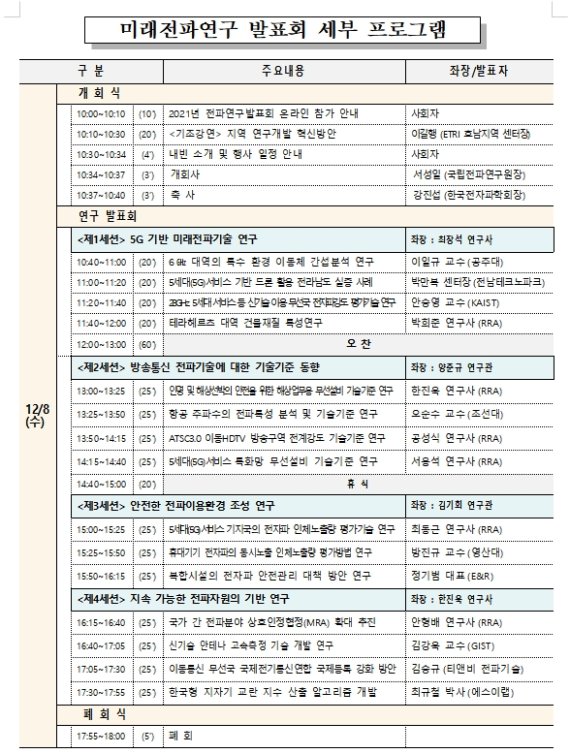 이번 발표회는 4차 산업혁명과 디지털 뉴딜 정책의 핵심 인프라인 전파의 미래기술과 안전한 전자파 환경 조성 등을 위해 산·학·연·관 전문가 15명이 지난 1년간 연구한 성과를 4개 세션으로 나누어 발표했다.