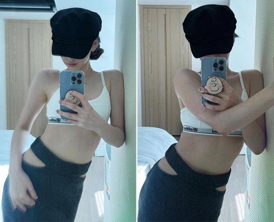 태연은 8일 인스타그램에 사진을 올렸다. 사진에서 태연은 브라톱에 니트 팬츠를 입고 셀카를 찍고 있다.