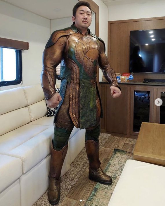 사진 속 마동석은 '이터널스' 속 길가메시의 의상을 입은 채 포즈를 취했다. 이어 또 다른 사진에서 마동석은 영국의 가수 겸 배우 해리 스타일스와 함께 서 있다. 두 사람은 함께 엄지 손가락을 치켜든 채 환한 미소를 짓고 있어 눈길을 끈다.