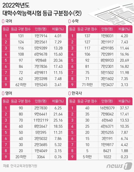 [표] 2022학년도 수능 등급 구분점수-국어·수학·영어·한국사