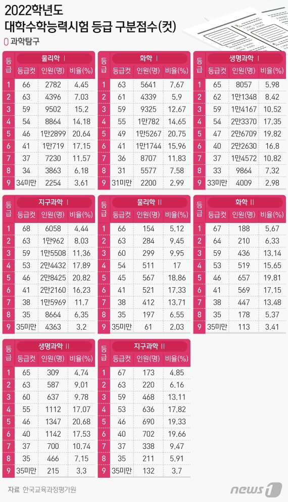 [표] 2022학년도 수능 등급 구분점수-과학탐구