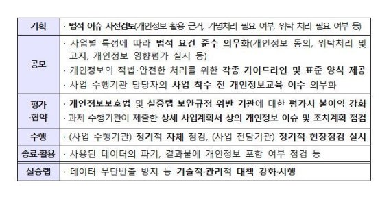 아울러 사업 기획단계에서부터 공모・평가・협약・수행・사후 활용 등 사업 全단계별에서 필요한 개인정보보호 강화 관리방안을 마련하였으며, 각 사업 전담기관들은 사업별 특성을 반영하여 적용할 계획이다.