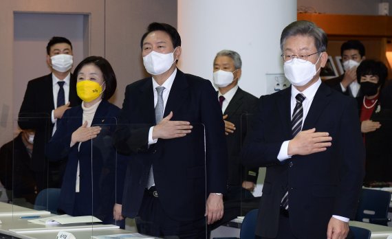 [서울=뉴시스] 국회사진기자단 = 이재명 더불어민주당, 윤석열 국민의힘, 심상정 정의당 대선 후보가 9일 서울 마포구 연세대학교 김대중도서관에서 열린 '김대중 대통령 노벨평화상 수상 21주년 기념식 및 학술회의'에서 국기에 대한 경례를 하고 있다. 2021.12.09. photo@newsis.com [서울=뉴시스] 류현주 기자 = 이재명 더불어민주당 대선 후보와 윤석열 국민의힘 대선 후보, 심상정 정의당 대선 후보가 9일 서울 마포구 연세대학교 김대중도서관에서 열린 '김대중 대통령 노벨평화상 수상 21주년 기념식 및 학술회의'에 참석했다.