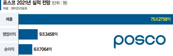 9일 관련 업계와 금융정보업체 와이즈리포트에 따르면 포스코의 연결기준 올해 실적 전망치는 매출 75조2758억원, 영업이익은 9조3458억원이다. 전년 대비 매출은 30.25%, 영업이익은 288.92% 각각 증가한 규모다. 지난 10월 3·4분기 실적발표 컨퍼런스 콜에서 제시한 올해 연간 매출 74조2000억원을 넘어서는 수준이다.