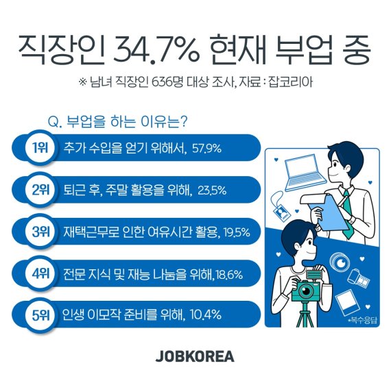 채용 플랫폼 잡코리아에 따르면 남녀 직장인 636명을 대상으로 '부업 진행 유무'에 관한 설문조사를 실시한 결과 응답자 중 34.7%가 현재 본업 외에 부업을 병행하고 있다고 응답했다.
