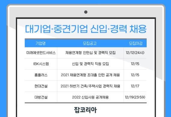 현대건설은 세 자릿수의 대규모로 경력직 직원 채용을 계획하고 오는 17일까지 지원자를 모집한다. ▲IBK시스템 ▲홈플러스는 15일까지 직원을 모집한다. 이외에도 대방건설은 19일까지 신입사원을 모집한다.