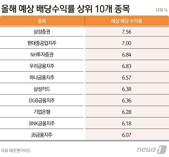 3위부터 10위까지는 NH투자증권(6.84%), 우리금융지주(6.83%), 하나금융지주(6.57%), 삼성카드(6.3%), DGB금융지주(6.36%), 기업은행(6.28%), BNK금융지주(6.18%), JB금융지주(6.07%) 등 모두 금융주다. 신한지주(5.63%), 삼성생명(5.19%), 한국금융지주(5.14%), KB금융(5.06%)도 5% 이상의 배당수익률이 예상됐다.
