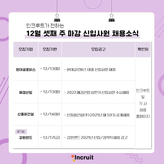 [서울=뉴시스] 박정규 기자 = 이달 셋째 주에도 현대글로비스, 애경산업, 신동아건설, 강원랜드 등 주요 기업들이 신입사원 채용에 나선다.