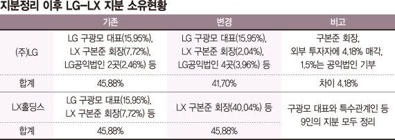 구 회장은 이번 매각 과정에서 고 구인회 창업 회장부터 이어져 온 LG의 사회공헌활동에 동참하기 위해 ㈜LG 지분 1.5%를 LG연암문화재단, LG상록재단, LG복지재단 등 3개의 LG공익법인에 나눠 기부했다. 이로써 구 회장의 ㈜LG 보유 지분은 종전 7.72%에서 2.04%로 줄고, 일가가 보유한 ㈜LG 주식의 지분까지 모두 합하면 2.96%로 공정거래법상의 계열 분리 기준인 동일인 관련자 지분 3% 미만을 충족하게 됐다. 구광모 대표 및 특수관계인이 보유한 ㈜LG 지분은 기존 45.88%에서 41.7%로 소폭 낮아졌으나 여전히 안정적인 경영권을 유지하게 됐다고 회사측은 설명했다.