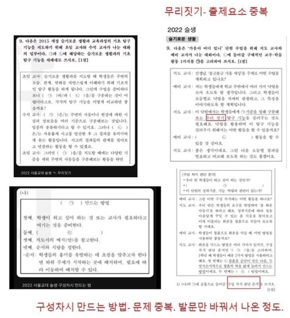 이들은 이 항목들이 A교대 모의고사와 2022년도 초등 임용고시에서 중복돼 출제되거나 비슷하게 나왔다는 입장이다.