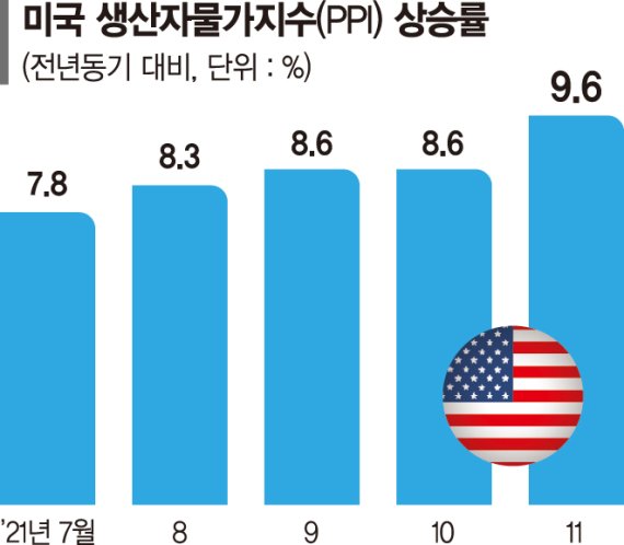 미 노동부 산하 노동통계국(BLS)은 14일 11월 PPI가 전월비로는 0.8%, 전년동월비로는 9.6% 상승했다고 발표했다. 전년동월비 상승률 9.6%는 BLS가 PPI를 집계하기 시작한 2010년 이후 최고 상승률이다.